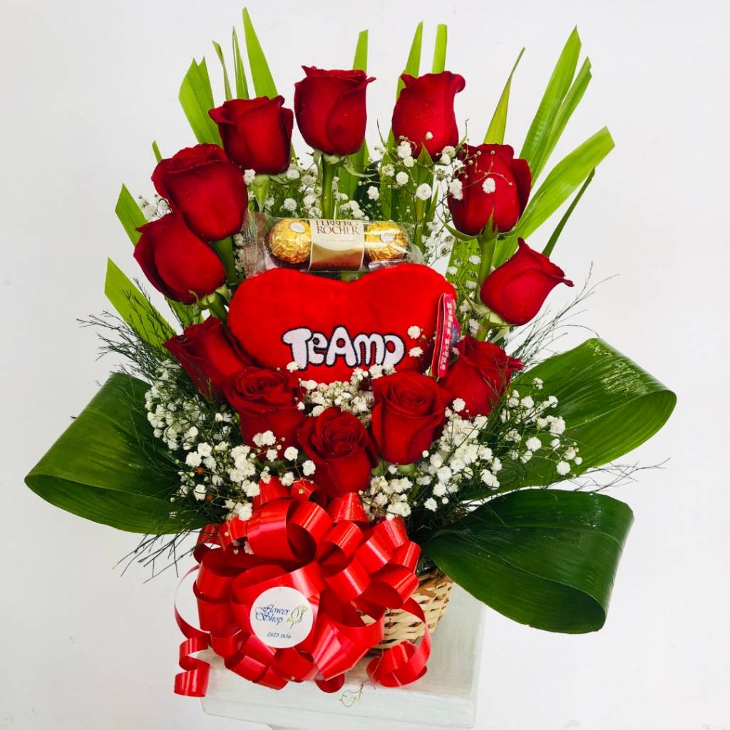 - Canasta con 12 rosas color a elección rojas, amarillas, blancas, rosadas,